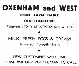 Mr. Oxenham came to Old Stratford in 1953 when he bought the milk round from Mr. Holton, of Deanshanger Road. He had just left a clerical job in the wages office of an iron foundry in the West Country, where he had been for 20 years, and had no experience at all of the dairy trade.