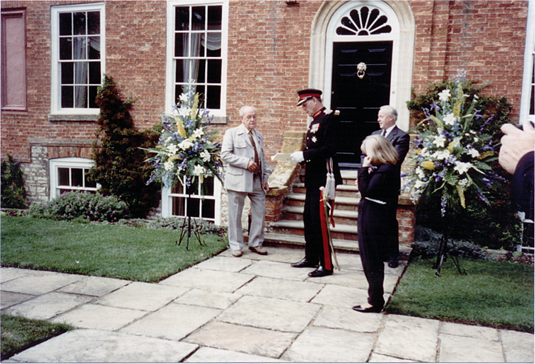 | Gordon Dunkly being presented with his BEM by the Lord Lieutenant of Northampton on the front steps of the Old rectory Yardley Hastings | |||||