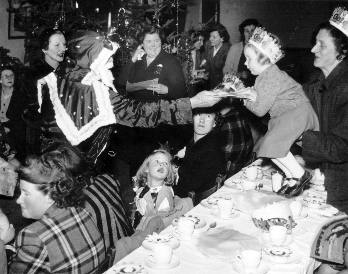 Girl getting present from Santa is Mrs J George nee Josie Denton, her mother Mrs Kath Denton holding her, lady behind santa Mrs Phelps agents wife from Castle Ashby. ladies in front, check coat Mrs Eleanor Adelaide Underwood (Addie),striped coat Mrs Jean Williams, lady sitting down in glasses Mrs Marie Braun
