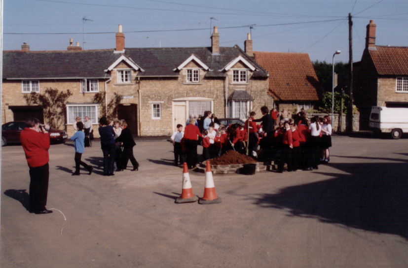Children from Yardley-Hastings Primary School Planting new tree, after new pavements and kerbing works finished All have been named waiting for overlay