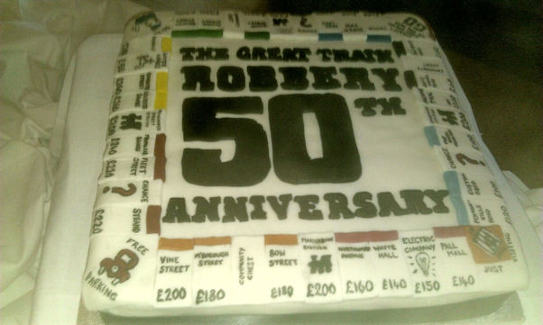 Exactly 50 years later, on the anniversary of the robbery, the Chief Constable of Thames Valley Police, Sara Thornton, held a commemorative meal to celebrate the work undertaken, by officers of the Bucks Constabulary, to bring to justice the gang responsible for this crime. The cake you see below on the left, in the shape of a Monopoly Board, was one of the central attractions, along with the real Monopoly Board again pictured below at the meal which was held at Eynsham Hall, Oxfordshire. The real board game (note the fingerprint powder still on the board) is on permanent display at the Thames Valley Police Training Centre Museum at Sulhamstead. The gang are reputed to have used real money when playing the board game at their hideout at Leatherslade Farm.