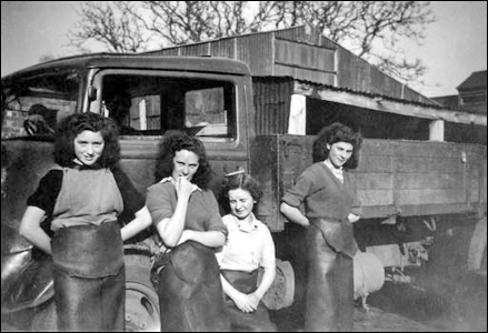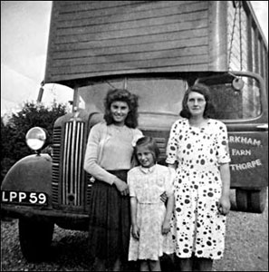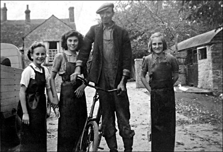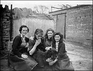 Stella Tattum came from Haversham, Enid King from Hanslope, Vera Scripps lived at Castlethorpe Mill, Barbara Pittam a Castlethorpe girl, all taking a break outside the dairy with Cana the dog. |