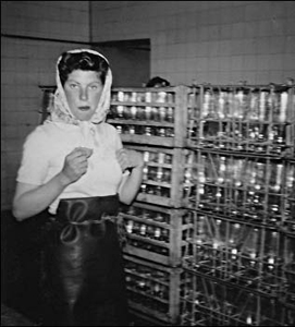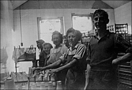 Barbara Pittam working in the dairy on the bottling machine.