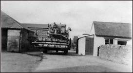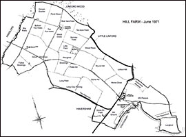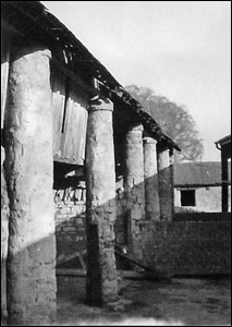 The image shows a most unique row of stone columns supporting the roof of a barn at Hill Farm. The fabric of each column is cut and shaped stones built in a buff mortar, and of a very early date.