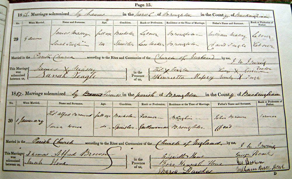 Maria Dawkes, George Howe, George Brown and William Brice Howe also sign as witnesses. No details of bride's father except that he was dead. 'Braughin' is probably Braughing in Hertfordshire.