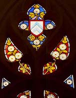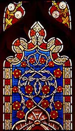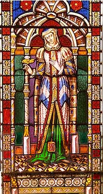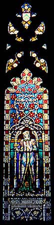 Jane Ingleton, as described on her monumental brass in the church. "Standing figure of woman in close cap, long coat with hanging sleeves, and girdle pendant to which is attached a small clasped book, with the Five Wounds stamped on the cover." The glass, in places, is acid-etched (same as Armorial window).