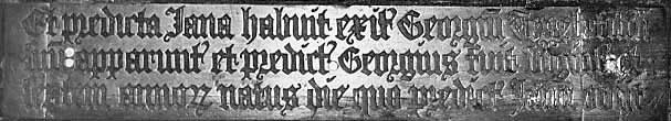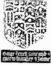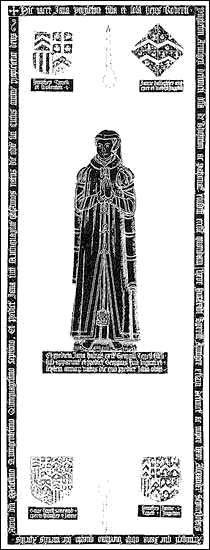 Script: Gothic minuscule 'script 6'. Heraldry: I: Quarterly: i, Argent, two chevrons azure within a bordure engrailed gules, TYRRELL, ii, Argent, a cross between four escallops sable, COGGESHALL, iii, Paly of six argent and sable, SWINFORD, iv, Gules, on a chevron engrailed argent three dolphins haurient vert, FLAMBERT. Underneath: Humfrey Tyrrell / of Wokenton. II (lozenge): Quarterly, i and iv, Argent, semy of crosslets fitchy azure, a chevron sable between three gryphons' heads erased azure, INGLETON, ii and iii, Argent, a chevron between three crescents sable flamant gules, also for INGLETON. Underneath, Janne Dawghter and / eyer of Robert Ingylto(n). III: Quarterings of TYRRELL as no I, quartering quarterings of INGLETON as no II. Underneath, George Terrell Sone and / eyer to Humfrey & Janne. IV: Quarterings of TYRRELL as no I, impaling quarterings of INGLETON as no II. Underneath, Humfrey Terrell / Janne Ingylton. Slab type: Grey Unio Purbeck marble. Dimensions: Figure 77 x 24 cm, foot inscr. 8 x 43 cm, marg. inscr. 1.89 x 0.68 m, 35 mm wide, shields 16 x 14 cm, lozenge 19 x 19 cm, small inscrs. 4 x 15 and 4 x 17 cm; slab 2.61 x 0.86 m. Previous uses: The slab has five or six visible cemented-in rivet holes, of which one certainly and the other possibly has a long channel leading from it, implying a previous use for fixing a brass of some sort, though no obvious pattern emerges: the slab may have been cut down. Of the brass plates, the foot inscription and the upper part of the sinister fillet of the marginal inscription have been examined, and have previous engraving on the back. The foot inscription is made up of four fragments: 1, fine Gothic minuscule of c. 1480, Perpetuis annis : Norwych miserere ioh(ann)is / Mater dei Memento Mei. (In eternal years, have mercy on John Norwich; Mother of God, remember me.) 2, Upper half of a line of competent Gothic minuscule, c. 1500: [pr]ay for the soule of Johan Pome which died the ...; 3, Fragment of Gothic minuscule, early 16th century: [... Cris]toffer co(n)fra[ter...] / [... propi]ciet(ur) de(us) am[en.] (... brother Christopher ... God have mercy Amen ...) 4, Fragment of similar script, Will(ia)m p... The marginal strip is of very fine raised Gothic minuscule 'script 4', which is dated 1530-47, beginning with a boar's head: The best songe that I canne is requiem eternam, part of a well known verse epitaph of which examples survive at Northleach, Glos., and Royston, Herts, both c. 1490-1500. Lost examples are quoted by Haines. Notes: Jane was nine months old on the death of her father Robert in 1503 (when he himself was still a minor); her mother Ann was the daughter of Sir Richard Empson, who was Robert's guardian; after Robert's death Ann and her new husband John Hugford attempted to sue the Ingleton estate in Chancery, whereupon Jane was removed from her custody and placed under the wardship of Dame Joan Bradbury, widow. She married Humphrey Tyrrell in 1517 (being then aged 14) and after his death in 1549 married Alexander St John. The palimpsests were recovered in 1984 and 1997 by B.S.H.E. References: Mill Stephenson, II; L.S.W. Bucks., 212-3; Lipscomb, Bucks., III, 118-22; V.C.H. Bucks., IV, 245; H. Haines, Manual of Monumental Brasses, (1860), p. clxxxi; R.H. Russell, 'The Monuments at Thornton, Bucks.' in Records of Bucks., VII, 52-60; Page-Phillips, Palimpsests 3rd addenda (1986) p. xvii and pl. 195. References: Mill Stephenson, II; L.S.W. Bucks., 212-3; Lipscomb, Bucks., III, 118-22; V.C.H. Bucks., IV, 245; H. Haines, Manual of Monumental Brasses, (1860), p. clxxxi; R.H. Russell, 'The Monuments at Thornton, Bucks.' in Records of Bucks., VII, 52-60; Page-Phillips, Palimpsests 3rd addenda (1986) p. xvii and pl. 195. |
