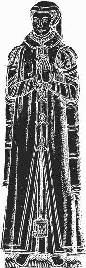 Date recorded: 2 May 2002. Description: Standing figure of woman in close cap, long coat with hanging sleeves, and girdle pendant to which is attached a small clasped book, with the Five Wounds stamped on the cover. An inscription plate under her feet, three shields and a lozenge of arms, each with a small inscription below, all enclosed within a marginal inscription. It was originally on a chest tomb, but since Willis does not describe this, it must have been quite plain. Style: London 'Lytcot'. (post Fermour) script style - Fermour Inscription: