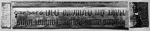5th January 1998 Your piece of inscription is part of a verse epitaph which you can find complete at Northleach, Glous., (M.S.IV) and Royston, Herts, (M.S.IV), both undated but c.1490 -1500. Haines (p. clxxxi) quotes lost examples at Baldock, Herts 1483, Maldon, Essex, undated, Romford, Essex, 1480 and St Martin's Ludgate Hill, undated, from Weaver (pp. 545, 610, 649 and 387), and Douglas Gray cites a seventh lost example from st Michael's Crooked Lane, London, for John Shrow, stockfishmonger 1487, from Stow, Survey of London p. 175 ("A Middle English Epitaph" in Notes & Queries, New Series 8, 132-5 (April 1961)). The epitaph is only the last stanza of a much longer poem found in MS Balliol 354 and printed in Mediaeval English Lyrics, ed. by RT. Davies, 1963, no. 109 (p. 206-7). Farewell my frendes, the tyde abideth no man Your fragment seems to be later than any of the dated ones hitherto known, as it is in John Page-Phillips’ “script 4” which flourished 1530 -1547. It may be monastic spoil, in which case date it 1530 - 39, or a workshop waster, which had been lying around for ten years before re-use. Can you tell from the condition of the metal if it had ever been used? It certainly looks very sharp and new on the rubbing. Presumably the rest of the verses are on the back of the remainder of the Thornton marginal lnscription, if you can manage to lift it. I am sure I have seen that little boar's head stop somewhere before, but I can’t place it. (I think that the boar's head might be of the Warwick family.) |