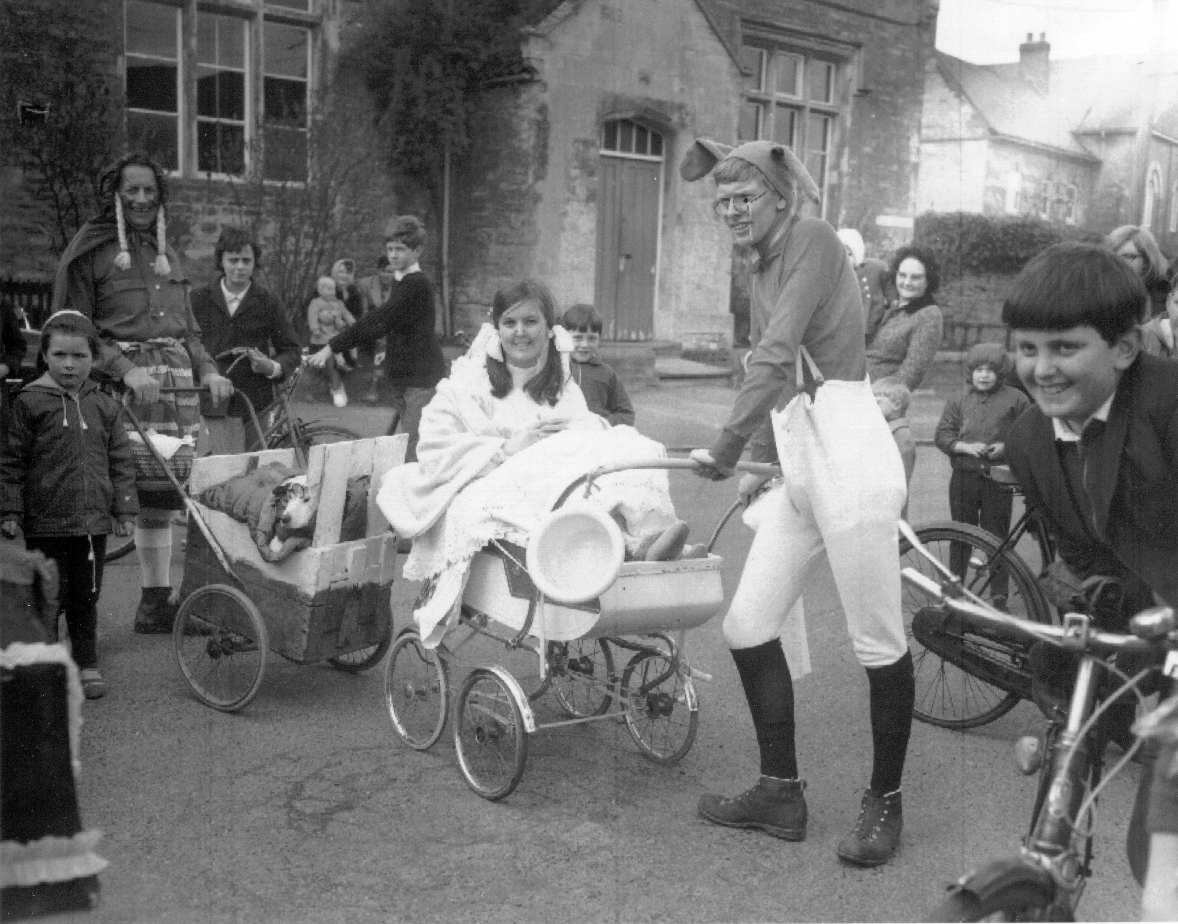 | Winners Neville Lack with Marion King in pram, Bill Underwood with baby Dog, Robin Brimacombe on bike, Phyllis Underwood behind and Doreen Ward sat on the wall | |||||