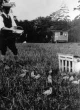 Keeper feeding pheasant poults