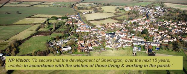 To secure that the development of Sherington, over the next 15 years, unfolds in accordance with the wishes of those living and working in the Parish. In particular maintaining Sherington's special rural character, whilst enriching it through thoughtful new development of housing, business and social amwnities, thus ensuring its future as a vibrant, sustainable rural community. |