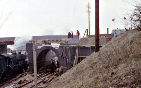 A steam train passing under the demolished bridge.