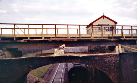 Railway bridge with the booking office on the left .