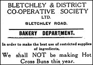 On Tuesday, May 2nd the fire brigade was called to a blaze at the Co-op premises in Albert Street. The cause had been a paraffin pump, but despite this disruption during the middle of the month in the National Competition for bread came the award of a silver medal to the Bletchley & District Co-op Bakery, and also seeking an award was Phyllis, the wife of Frank Howard, who, trading in Aylesbury Street as Phyllis Cooper, ladies hairdresser, claimed £8 6d from a printer at The Studio, Park Hill, Carshalton. Her order for cards had been promised for delivery in February, but although despatched, the consignment was suffering a delay through ‘war conditions’. War conditions were also causing a problem for Rowland Bros. who, now being engaged on war work, and requiring more room at their premises, consequently invited people to come and take away free sawdust, providing they brought their own bags. Not of course -since ‘New ones are expensive’ - in handbags for which, together with leather goods, a repair service was offered at 28, Napier Street by Mr. Freeman who, should maintenance be required on his machinery, could always approach Mr. Davis, who repaired and overhauled sewing machines at 114, Buckingham Road. Perhaps his services were also of interest to the lady at Flat 103A, Bletchley Road, (‘sidesteps to entrance’), who from discarded coats, costumes etc, with ‘customers own material’ offered a dressmaking and alterations service. For the proposed Industrial Magneto Co. factory, on July 28th, regarding the provision and laying of the water and sewage main in Denbigh Road, at a special meeting of the Council the Surveyor said that in view of the difficulty of finding competitive tenders, he had obtained a price from William Press and Sons. They were presently at work in the urban area, and, due to the urgency of laying the main, he would therefore engage the firm before he left for his new appointment . Important news came towards the end of July, when the combined newsagents of Bletchley announced that due to wartime conditions, and a shortage of labour, from Monday, 31st July they would charge 2d per week for newspaper delivery. There would soon also be a temporary shortage of labour in the town’s butchery trade when, due to ill health, Mr. John Colgrove retired from the family business. His successor would be Fred Todd, of Chandos, Crescent Rise, Luton, to whom Mr. Colgrove recommended his customers, thanking them for their loyal support during the 34 years that he had been in business. In fact following the tradition of his father and grandfather, he had been connected with the Bletchley butchery trade for over 40 years, and his brothers being respectively a butcher, butcher/farmer, and farmer, John had come to Bletchley from London, to work as a butcher’s boy for David Edwards. Later he worked at Banbury and Stratford upon Avon, but then returned to manage two declining businesses in Wolverton. Having made both these profitable, he next started at 9, Victoria Road, and shortly afterwards married Mildred Marlow, of Silverstone. With trade flourishing, at 23, Victoria Road he duly developed a wholesale business, and in this he would receive much help from Sid Marks, whom he employed for over 20 years. During World War One, and the present war, he acted with Hugh Sipthorpe as a Government grader, and, in other activities, at the request of the Ratepayers’ Association, he contested the Fenny Stratford Ward of the Urban District. Despite the failure of his first attempt, he was elected a year later with a good majority and held the position for 15 years, serving for three years as chairman, and also vice-chairman. Whilst chairman of the Recreation Ground Committee, the children’s amusements were installed, and during his service as chairman of the Cemetery Committee, a public convenience and mortuary were built in George Street. As for other interests, for 38 years he acted as a local preacher to the Methodist church. In early August, the Council considered Plan 1332, for covering the loading space in the Osborne Street factory of Tetley and Co., and, in late August, someone in need of a cup of tea - or something stronger - was William Cox, a Co-op baker’s roundsman of 152, Water Eaton Road, who, when he called at a house in Botolph Claydon, had been bitten on the thigh by a black Scottie dog. In fact this was not his first painful encounter with the pooch, and the lady owner was ordered to keep the animal under control. She was also fined 14s 6d, in the aftermath of which no doubt rover was hardly left feeling as pleased as a butcher’s dog. Yet on the subject of butchers, Mr. Tookey, of Bletchley Road, now required a full time lad, as did Mr. F. Todd who, having taken over Colgrove’s business in Victoria Road, further needed a young lady to act as a cashier. For another long established business in the town it was then time to pull down the shutters when, aged 88, Bletchley’s oldest trader, Mr. Reuben Brett, died in September, leaving a widow, a son, and two daughters. Living since 1878 at his drapers shop in Aylesbury Street, he had been in the outfitting trade for 64 years, of which 61 had been on his own account. Born in Beachampton, he learned his trade at Wellingborough, and moved to Bletchley 64 years ago to work for Mr. White. He then took over the business three years later. Achieving renown in his younger days for being the best ice skater in the district, he was also adept at riding a penny-farthing. With apprehensions of winter, Mr. A. Holliman, painter and decorator, of 17, Tavistock Street, now advertised that after October he would seek ‘Inside Work for preference’, but perhaps such stipulations could not be applied by Mr. W.J. King of 43, Saffron Street, who had purchased the business of the J.J. Window Cleaning Co., and ‘aims to give complete satisfaction.’ Obtaining complete satisfaction was also the aim of the Bletchley Co-op S
