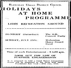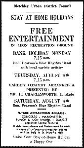 In connection with the Government’s Stay at Home Holiday Scheme, at the end of July the Council began planning arrangements for the public free outdoor entertainments, which would take place in Leon Rec. on various dates during August. Residents were asked to ‘Consult the posters at the entrance to the Recreation Ground for particulars of dates and types of entertainment’, and in consequence, on Thursday, August 6th Vera Stapleton’s Dance Band performed with local artists from 7.30p.m. In the company of various artists, Ron Pearson’s Blue Rhythm Band then played from 7.15p.m. on Saturday, August 8th, and again featuring Vera Stapleton’s Dance Band, arranged and compered by Lorna Webster a concert by local artists took place, on Wednesday, August 12th. As for future attractions, these would include concerts, marionettes, Punch & Judy shows, and dances, and should the weather prove unfavourable, then the activities were to be held in St. Martin’s Hall. With Councillor Sid Maycock as an ‘excellent entertainments manager’, the ‘Stay at Home Holidays’ proved a great success, and in fact a Sunday programme of music held in Leon Rec. by the R.A.F. (Cranfield) Band attracted a crowd of over 2000. Entertainments in the later month then included at 7p.m. on Wednesday, August 26th Charles Wreford, (of B.B.C. ‘Pig & Whistle’ fame), in ‘Granfers Gaieties’, by courtesy of Bletchley & District Co-op Society Education Committee, Mr. Ernest Elliott’s popular marionettes, and, with contributions from Rowland and Laddie Doggett, a ‘Hidden Talent Show’. In St. Martin’s Hall, featuring Vera Stapleton’s Band ‘and guest artists’ the programme then concluded with a Grand Finale, and, on Sunday, August 30th, also a United Service in Leon Rec, arranged by Bletchley United Christian Council, with massed choirs from local churches and ‘no collection’. In fact the Stay at Home schedule had showcased a wealth of local talent, and when at the last event Mr. F. A. Bates, Chairman of B.U.D.C., revealed his talent for singing, the performance earned him an ovation. Under the chairmanship of the Reverend C. Wheeler, at the beginning of September the Relief Committee of the Bletchley Emergency War Relief Fund met at 137, Bletchley Road, whilst as for the Clothing Sub-Committee, they now held monthly meetings to make or alter garments for evacuated persons in need. Possibly also in need was Mrs. Cattle, for shortly she would successfully seek an increase in her wage from 40s a week to 45s, from November 7th. She was employed as a clerk in the billeting office, and billeting matters would now include the argument of Mr. Bodsworth, of 33, Albert Street, that due to a defective roof his available room was unsuitable for accommodation. This, however, met with a measure of official scepticism, and would be therefore referred to the Surveyor, with a view to the owner carrying out repairs. When these were complete, the Billeting Officer was then to place one or two persons at the address. Elsewhere, Mrs. Stephens, of 19, Leon Avenue, had now gone away for four or five weeks, and in consequence a man billeted at the house had imported his wife and family to look after him! It was therefore decided that when Mrs. Stephens returned, the previous billeting situation would resume, including the re-accommodation at the house of the other members of the Bletchley Park staff, who had been temporarily removed during Mrs. Stephen’s absence. Only on condition that the necessary bedding was provided did Mrs. Adnitt, at 78, Western Road, agree to accept two male billetees, whilst for Mr. W.J. Brown, of 23, Bedford Street, his appeal was allowed because the voluntary public duties being carried out by his wife meant that she was away from the house most days of the week. The appeal of Mrs. Green, of 22, George Street, was also allowed, subject to her providing an employer’s certificate confirming her work of national importance, but matters were not so accommodating for Mr. J. Colgrove. Without permission from the Council, he had let 9, Woodbine Terrace and in consequence was given seven days to remove the present occupants. Failing this, the Billeting Officer would report to the Council, with a view to the instigation of proceedings. The billeting of 2, Denmark Street, would now become the focus of a prolonged dispute when on Tuesday, September 15th at a meeting of the Lodging Restriction Appeals Committee the appeal by the owner, Mr. J. Garner, against the refusal to allow Mr. F. Moseley to occupy the premises was heard at the Council Offices. Both men attended, as well as Mr. Moseley’s solicitor, Mr. Ernest Marchant, but after considerable discussion, the appeal was refused. However, it was then revealed that both the Regional Commissioner and the Ministry of War Transport had requested that the Ministry of Health should instruct the Council to release the premises for Mr. Moseley, and if the existing requisition was not withdrawn then, for the property to be re-requisitioned, arrangements were to be made between him, as the prospective tenant, and Mr. Garner. Nevertheless the saga continued, with angry scenes on Wednesday, 16th September when Mr. G. Gaylor was informed by a letter received that morning from the Clerk of the Council that ‘having been let to a railwayman’, the house that he was to occupy had by the decision of the Committee been derequisitioned the previous night. A factory worker, Mr. Gaylor had already moved from London and was awaiting the arrival of his family, and the predicament was further compounded since having let his London home, he had already transferred some of the furniture to Bletchley, intending to move in on Friday. Therefore, in view of the Committee’s decision Mr. Gaylor and his fellow factory workers felt understandably aggrieved, and having swiftly organised a rota of five persons at a time to picket the house, and so prevent the removal of the 