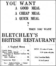 During June came the introduction of dried eggs in tins, with people allowed one tin - equivalent to 12 eggs - every eight weeks. Also during the year, it was decided that children would receive an additional 10 clothing coupons, and in record time during June the new ration books were issued. By Wednesday, June 17th most people had received theirs and in fact by Saturday week the Food Office had the books ready which, despite their depleted staff, were then despatched via the G.P.O. With Mr. W.J. Elliott as the builder, during the first week of July at the back of the Council Offices work began on the British Restaurant. Local bricks were used for convenience in the construction but due to a Government ban on ceilings, a new type of tubular roof truss, to simplify cleaning, would span the 63 feet square building, the completion of which was scheduled for the Autumn. With warmth throughout the winter months provided by six overhead gas heaters, cooking would be also by means of gas although coal burning ranges were included for use during an emergency. The kitchen featured all the latest labour saving devices, and perhaps the sale of kitchen utensils was partly responsible for the vibrant trade at the Bletchley Co-op Society which, for the year ended July 11th, returned an increase of over £8,000 on the previous six months. This was despite the introduction during July of the rationing of sweets, the monthly issue of which became an event of great importance for children, who on Sunday mornings would form a long queue outside the shops of Jack Parriss, in Victoria Road, and the Kandy Store, in Bletchley Road. Stored loose in a multitude of glass bottles, the sweets would be carefully weighed into portions and exchanged for coupons. Favourites included sherbet dabs, lemonade powder, and liquorice sticks, and if lots of small sweets were purchased and counted into a daily quota, it might be possible to eke out their consumption, although even so the monthly ration rarely extended to more than a week! If toffees were unwrapped and put in an old Elastoplast tin, they would eventually coagulate into a bar and if taken to school, by covertly opening the desk lid every so often a quick bite could be taken. However, should the teachers catch a glimpse they would ‘go bananas’, and confiscate the tin until the end of the lesson! Also with disapproval they viewed the practice of throwing at the ceiling the sharp nibbed school pens, of the type that had to be dipped into desk mounted inkwells, the refilling of which was the responsibility of those children favoured as ‘ink monitors’. A letter dated August 10th was now received from the Food Executive Officer suggesting that since Mr. J. Hicks had left the district - and therefore the Bletchley Urban Food Control Committee - Mr. Allen, of Rugby House, Church Green Road, should be appointed to the vacancy. At a meeting of the Council, this was duly agreed the following day, and perhaps amongst Mr. Allen’s first concerns was the preservation of fruit, one of the featured topics when the Co-op invited interested persons to an information bureau on Thursday, Friday, and Saturday, August 20th, 21st and 22nd - ‘County Council Rural Domestic Economy Staff will be in attendance.’ During mid September, concerns were raised as to why some railings and chains in the town had been removed and not others. As well as the gates at Bletchley Park, railings in Manor Road, around the police station, the Baptist church, and in Buckingham Road had all been allowed to remain but not those at Water Eaton Road and Grove Road, and within 10 minutes of one fence being removed, children had overrun an orchard! With economies in the use of fuel becoming increasingly essential, in a novel reminder the Assistant Divisional Coal Officer now asked the Council to have a fuel slogan printed on the next half years rate demand notes. His wisdom was duly adopted, and ratepayers were hopefully assured that the Council was spending their money wisely when as one of several amounts during the year, the sum of £250 was paid to H. Hartley and Co. Ltd., for roofing at the British Restaurant. Despite some difficulty in obtaining many of the fittings, during mid September the Surveyor then reported that the British Restaurant should soon be complete, and the Minister of Food, Lord Woolton, would be asked to perform the opening. Covering most of the Urban Council yard, within the building was accommodated a large cold room and also a dining hall able, at tables of four, to seat 80 people. At 1s each, about 240 midday meals could be served daily, and at a paydesk at the kitchen entrance customers purchased a ticket which, when presented at the counter, entitled them to a meal. With no waitresses employed, patrons would help themselves and then take their dishes back to a hatch, and in fact the only staff were a cook/manageress - who at a wage of £3 15s per week had yet to be appointed - and a few kitchen helpers. By a notice from B.U.D.C., during August, September, and October, in one period householders were not to ‘acquire more coal than will raise their stock to 1½ tons, and must not order more than 1 ton.’ In addition, coke or anthracite could not be ordered to bring the total over three tons, except under licence from the Local Fuel Overseer, for whom at a salary of £250 p.a. an assistant, not liable for military service, was now being sought. Unless extended by a resolution of the Council, the temporary post would be for not more than two years, and in measures to conserve the available fuel supplies people were being urged to share their fires with neighbours. Adequate clothing was also essential to keep warm, and from fashions created by leading designers the Board of Trade duly selected a range that manufacturers were asked to consider for mass production. These ‘Utility’ clothes were then first shown to the press in September, 1942, and had to made from speci