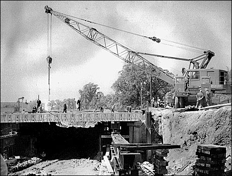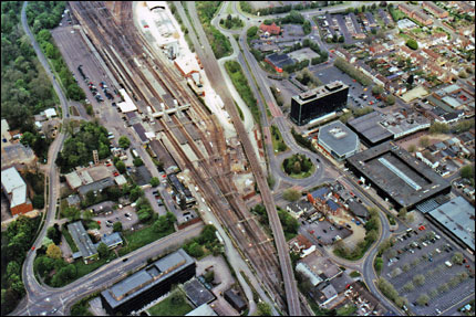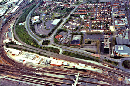 Not everyone was enthused, however, and in January, 1956 for their Tuesday meeting Bletchley councillors met ten minutes earlier to both discuss and vote on a resolution opposing the British Transport Commissions Bill which, now pending in Parliament, included the flyover proposals for Bletchley. After a long debate the councillors then decided by eight votes to one to withdraw their petition but only subject to the Council being granted the right to negotiate - and if necessary at a later stage petition for - a 40 feet bridge span over Water Eaton Road, instead of the 25 feet planned by the Commission. Also the Council held concerns regarding other associated matters, including the amount of property that would be affected in Duncombe Street, the need for improvements to the underbridge in Bletchley Road, and the effect on the North Street housing site and the owners of houses in Tavistock Street. Removing from the Bill the proposal to lengthen the main line bridge over Water Eaton Road, the Commission duly conceded a number of points, and they would also investigate the possibility of widening the branch line on the other side of Tavistock Street. Moreover, with a clearance of 17½ feet above the main line, to allow for the future electrification of the track, the flyover would bebuilt in such a manner as to allow any need for subsequent realignment to the underbridge. Yet however it was aligned, the flyover would bring about the loss of the British Railways Staff Association sports field, by cutting across the ground and so rendering the facility useless for football and cricket matches. With a branch membership of around 350, a new ground had therefore to be sought although with great reluctance in view of the care and attention that had been lavished on the original. However, on a more optimistic note the new club premises were almost ready, and would be officially opened on September 5th. They had been constructed out of the old railway canteen and included a large games room, a smaller committee room, bar and toilet facilities. In August, 1958 a meeting was held between the British Transport Commission, Buckinghamshire County Council, local authorities, landowners, and the N.F.U. to explain the proposals for the new marshalling yard at Swanbourne, and during the following month work then began on the flyover project although to protests from the Bletchley branch of the N.U.R. that inexperienced contract labour was being employed on Sundays. In preparations for the construction of the flyover, two shopkeepers occupying private property had received notice from the railway authorities that they must leave by October 12th and a number of private house owners were also informed that parts of their land would be needed. During the month, since they stood in the direct line of the flyover, the premises of a clothing shop at the corner of Duncombe Street were to be vacated, as also the adjoining café occupied by Mrs. Perrin, and so would come to an end her long established business in the town. In fact it had been almost 21 years since Mrs. Perrin had first opened her café and confectionery shop, (having previously occupied two hutted shops opposite the Park Hotel), and even before then she had been employed for many years as a shop assistant in the town. With her working life now at a close, she would retire to live in a Council house in St. Pauls Road. The first phase of the extensive project, the actual building of the flyover, was undertaken by Faircloughs Ltd. and with the foundations being as deep as the construction was high, the work was scheduled for completion by October, 1959. Contracted to Demolition and Construction Ltd., during that year the second phase, to construct the three approaches to the flyover would then take place over a course of 12 months. Meanwhile, at the Oxford end the new earthworks would extend for about a mile and a half along the present route of the branch line which, slewing out towards the Newfoundout, would have to be widened to allow for the junction with the new flyover line. Also needed would be retaining walls about 500 feet in length, to bring the new line to the flyover abutment. At the Denbigh end, work would begin near the Associated Ethyl laboratories, towards which a large cutting would have to be made. The new line was then to be raised by walls and embankments to a new ‘Skew Bridge’, of pre-stressed concrete, with three large piers, and this would carry the track over the present Bedford branch line to the flyover. At the Cambridge end, work would begin on the Bletchley side of Stag Bridge, (although without causing interference to the Watling Street), but with some two miles of sidings taken up, there was a need for the small bridge over Denbigh Way to be enlarged. Since the flyover approach from the north and east would cover most of the present goods road, a new goods road would be built, passing through one of the arches in a semi circular sweep to the yard. As a consequence of this new arrangement, alterations would make the goods office into a two storey building and alterations would also be made to the shed. With the trader store repositioned, a second one was to be built alongside and a new weighbridge installed. In addition, the several buildings containing the district engineer’s and signal engineer’s offices, workshops and stores would be demolished, and then re-accommodated in a large single storey building. In December, 1959 Bletchley Road was finally spanned by the new flyover when 14 concrete beams, each weighing 22 tons, were lifted into position by a giant mobile crane and the following year the construction was even featured on the front page of the prestigious British Rail publication ‘Transport Age’.