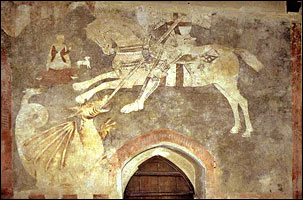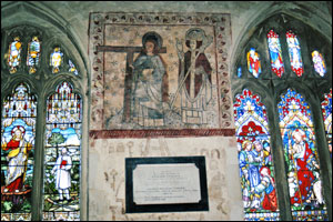 At Broughton, consisting of a chancel, nave, south porch and embattled west tower, the church of St. Lawrence dates mainly from the late 13th and early 14th centuries, and from this period on the walls of the nave may be seen several magnificent ‘morality paintings.’ Having been covered over at an earlier date, they were discovered by the rector in 1849, and are amongst the finest to be seen in our region. As an age of general illiteracy, in medieval times the intent was to portray religious scenes to the congregation, and more especially the consequence of straying from the Biblical teachings. Thus it is no coincidence that on entering the church by the south door the first depiction to be seen - directly opposite, above the north doorway - is that of the Last Judgement. On the south wall is portrayed St. George on horseback, slaying the dragon, and also on the south wall are to be seen two figures, one of whom is holding a T shaped cross (known as the Tau Cross.) In fact this is held by St. Helena, the mother of the Emperor Constantine, who reputedly discovered the true cross. Beside her is probably St. Eloi, the patron saint of blacksmiths, since the tools of his trade are depicted below the painting. As for the north wall, here may be seen a ‘Pieta,’ ie. a representation of the mutilated body of Christ in his mother's arms. Apart from the paintings, also of note in the church are two ancient chained books, resting on shelves either side of the chancel arch, and one, by Bishop John Jewel, is an ’Apologie,’ or defence, of the Church of England. Regarding the nation’s religion, between 1549 and 1662 the English Acts of Uniformity were passed, but with this provoking reaction from the ‘Dissenters,’ - those not accepting the established church - the Bishop’s book, printed at Fleet Street, London, and dated 1567, is an early defence of the accepted practices of the Church at that time. In the then rector’s handwriting, on the opening pages of the other book is recorded that its purchase was made in 1632 for the church and parish, the volume being by Erasmus and entitled a ‘Paraphrase of the New Testament.’ Erasmus, who occupied the Lady Margaret chair of Divinity and the chair of Greek at Cambridge in the early 16th century, attempted to introduce a more rational Christian doctrine, and in fact his tutor was William Grocyn, who, as a past rector of Newton Longville, is commemorated in the village church by a brass on the north wall as the ‘First Teacher of Greek in the University of Oxford.’ In this day and age, the murals of Broughton church may be viewed on the appropriate web site, but for anyone wishing to see them as they were intended, please note that the key to the church door has to be inserted into the lock upside down!