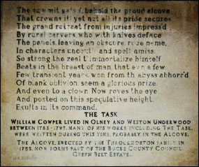 I need a woman. Not for any dubious intent, but because they can apparently ‘multi-task’ - although it might seem that blokes prefer to do one job properly, rather than bodge six. ONLY JOKING! But the fact remains that in my little writing ‘den,’ at the bottom of the garden, several jobs have acquired an increasing urgency, and not least the need to fix a leaking roof. Oh well, true to gender, perhaps for now I’ll just make a list. In fact blokes and ‘dens’ seem to be synonymous, and this would certainly be so for the poet William Cowper, whose home from 1767 until 1786 would be Orchard Side, at Olney. A gentle, if rather depressed soul, William would seek inspiration for many of his famous works in a summer house in the garden, but when on April 26th 1900 Orchard Side was presented to the town by Mr. W. Collingridge, to become the Cowper and Newton Museum, the garden, in which the summer house was situated, was separately owned. Thus when the Museum trustees were offered first option to purchase the freehold, following a meeting in November 1918 they decided to try and raise the necessary £325, and, with this being successful, the opening ceremony for the garden and summer house was performed on Friday, September 19th 1919 by the Marquis of Lincoln, the Lord Lieutenant. Many notables were present, and in the afternoon a procession of 300 schoolchildren from Olney and the local villages marched along the High Street to Orchard Side, lead by the Town Band. William Cowper’s acquaintance with Orchard Side came to an end in June 1786, when his cousin, the Lady Hesketh by marriage, arrived to live in the town. Appalled by the ‘tottering’ condition of the house, and the thieving disposition of the servants, she swiftly arranged for more suitable accommodation in the nearby village of Weston Underwood, and here William, and his companion, Mrs. Unwin, would begin a new life on November 15th 1786. Yet William seemed far from saddened by this move, for he would now be near his friends the Throckmortons - or ‘Mr. and Mrs. Frog,’ as he affectionately called them - of Weston Hall. Finding inspiration in the surrounding countryside, William would often indulge in rural walks, and sometimes it would be during these that within the tranquil embrace of the ‘Alcove’ he would retire to write. Of hexagonal shape, with three sides open, this had been built by John Higgins in 1753 as a woodland summerhouse for Sir Robert Throckmorton, and, enhanced by views across an extensive sweep of ground, laid out by the renowned ‘Capability Brown,’ it was of little surprise that his poetic abilities were greatly heightened by this situation. However, recently a bank of wind turbines has been plonked right in the middle distance of these inspirational views, and although William had an interest in many innovations (from hot air balloons to medical ‘electrical machines’) it remains conjecture as to whether he would have found the present sight of the flailing arms revolutionary, or whether it would just have given him another depressive turn.