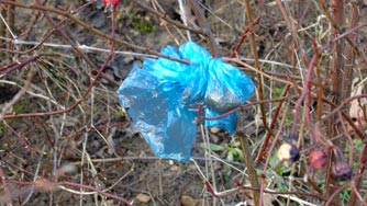 Full marks for picking up the little offerings but 0 out of 10 for then chucking the bag into the shrubbery. Left to its own devices the offending 'stuff' would biodegrade with time, although a hazard to footwear meantime, however in a plastic bag it will be there for ever!!