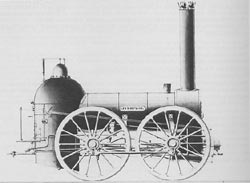 | J E McConnell was appointed Superintendent in 1847 and Wolverton expanded. 1849 saw McConnell build his first locomotive at Wolverton, the prototype of the 'Bloomer' class (the wheels and works being more exposed the engines became know as Bloomers after Mrs Amelia Bloomer who was trying to reform ladies dress). During his time at Wolverton he made many innovations such as train heating, failsafe braking, hollow axles, boilers, fireboxes etc. Early in 1851 the first Bloomer engines were running (a replica Bloomer is on display outside Milton Keynes station). | |