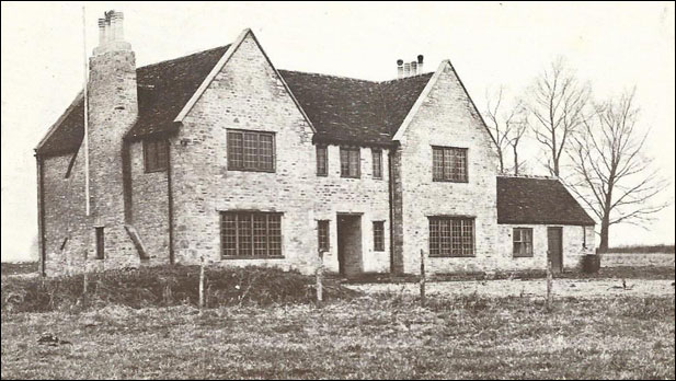 is newly erected of old stone, roofed with old tiles in the gabled Elizabethan style. It stands well back from the road and is entered through an oak door, which gives access to