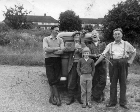 ?, Jim Burrows (from the Plough), Sue, Eglesfield, ?. and Sid in the Barley Mow car park.