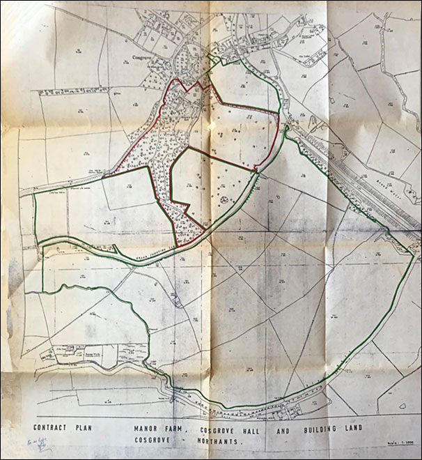 All that Farm messuage dwellinghouse land and premises known as “The Manor Farm” Cosgrove in the County of Northampton a small portion thereof being in the County of Buckingham containing in the whole 283.007 acres or thereabouts but as to Ordnance Survey no 240 to the extent only of the Vendor’s interest (if any) therein as the same was then in the occupation of Richard Holt Maycock as Tenant thereof and were more particularly described in the First Schedule thereto and delineated for the purpose of identification and not of limitation on the plan annexed thereto and thereon edged with the colour red together with the rights privileges and easements specified in the Second Schedule thereto and together also with the benefit of the Tenancy Agreement mentioned in the Third Schedule thereto Subject Nevertheless to the said Tenancy Agreement mentioned in the Third Schedule thereto and subject also to the rights matters and things mentioned in the Fourth Schedule thereto