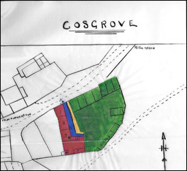All that freehold property fronting Main Street at Cosgrove in the County of Northampton which is delineated on the Plans no 12 & 3 (?) annexed thereto and thereon coloured pink and also the land coloured blue on the said Plan no 1 together with a right of way at all times and for all purposes with or without vehicles over the piece of land coloured yellow on the said Plan no 1 which said piece of land forms the Easterly portionof the entrance way or drive to the dwelling house forming part of the property thereby conveyed which is delineated on the Plan no 1 annexed thereto and the 8 adjoining dwelling houses and premises owning by Walter William Dickens coloured green on the said Plan no 1 (plans 2 & 3 not subject of the abstract)