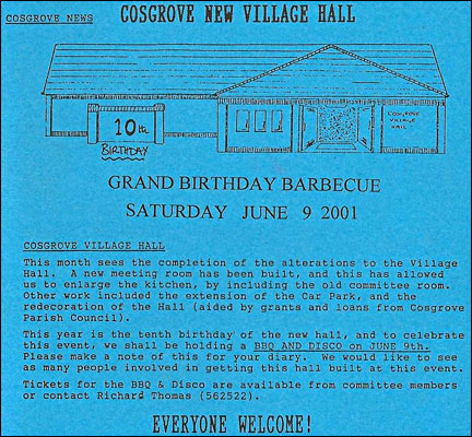 For over 41 years the Victory Hall served Cosgrove well. Two of the original cherry trees in front of the Victory Hall were planted in memory of Chris Whittaker, who lived in Bridge Road.