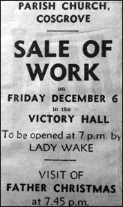 Mrs. Winterbottom, in declaring the bazaar open, said it was a great pleasure to have the unique honour of opening the function in her own house, and more pleasure because it was to raise funds for their village hall, which was a sadly needed want - a building where the people of Cosgrove could dance, hold concerts and wedding receptions, without having to make the long journey toStony Stratford and Wolverton. “Village life is very important, and anything to bring the residents together should be encouraged and helped, and that is why I ask for your generous help tonight. Make it your thanksgiving for all our blessings and a great victory,” appealed Mrs. Winterbottom.