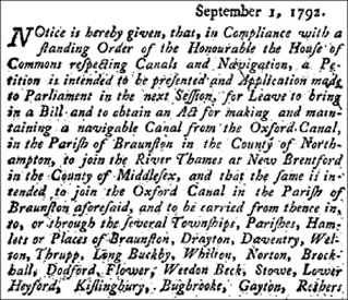 At the beginning of September 1792 the statutory notices were published in the principal papers covering places on the proposed route.