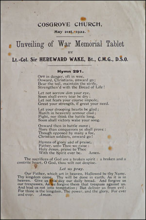 With the closing verses of the hymn, “Through the night of doubt and sorrow,” the Rev. R. Stanham, with the Rev. Nelson-Ward and Lt. Col. Sir Hereward Wake, Bt., C.M.G., D.S.O., of Courteenhall, Northants, proceeded to the memorial tablet, which had been placed on the west interior wall of the church on the left side of the porch doorway. Sir Hereward, a member of a soldier family, wore a khaki uniform of the King’s Royal Rifle Corps. Reaching the tablet with the Rev. Mr. Stanham to unveil the tablet. Stepping forward he pulled taut the fastening string which let fall the Union Jack previously shrouding the memorial. A handsome bronze tablets was revealed, bearing the following inscription: - “To the glorious memory of the men of Cosgrove Parish who laid down their lives in the Great War, 1914-18 Capt. St. L. Atkinson, Sgt. H. Tack, Cpl, E. Tack, L/Cpl. W. Brown, L/Cpl. W. Key, Bombdr. W. Moore, Trpr. R. Panter, Ptes. C. Austin, J. Brown, G. Bugby, H. Butcher, A. Childs, R. Childs, G. Cripps, A. Curtis, P. Frost, F. Green, H. Green, W. Grace, E. Munday, E. Mandeville, J. Ratcliffe and H. Swain.