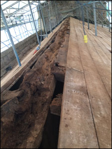 The two photographs above show the main ridge beam in desperately poor condition.