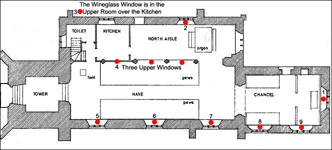 Few of the windows in the church are entirely originals. Only the one behind the altar has any pretensions to real antiquity, and in the chancel the stained glass is of generally mediocre quality. Most of the windows were newly glazed with poor 'cathedral' glass at some time during the 19th Century. However, by 1774 the windows in the South wall of the nave and in some other parts of the church had been reglazed, and they bear armorial devices which were tentatively identified as follows during an investigation carried out in the 1950's. The shield which is barry wavy of ermine and black stands for the family of SPENCER or BRADWARDEN, impaling three crescents for OLIPHANT, BOWNE, HAMLEY, HANLOWE, LECKIE, KIRWAN, PERIENT. Why any of these families should be connected with our parish church is unclear: it is also possible that the crescents mentioned are 'cadency' marks - that is, devices applied to the family shield by a son or younger son to show the difference between his own and his family's arms. The three cinqfoils on the white shield signify the DARCY family, whose connection with the village is obscure as that of any of the foregoing. The shield marked with a vertical bar between two chevrons would seem to belong to the families of BOMSTEAD or TENDRING, and the red chevron on the yellow background denotes STAFFORD. The ermine shield with two rings on it, and a black bar across the top bearing three crosses is associated with the WITCHING-HAMS . It is next to impossible to make any but a precarious guess at what these people had to do with the church, or why they should be commemorated in our windows. The families are not noticeably local ones. However, the considerable reconstruction of the church which was undertaken in the 1770's must have required expenditure and so it is not beyond possibility that these people were approached by the Rector for grant or loan and were forthcoming. Less elusive are the Moorsom and Mansell crests: Mansell (variously spelt) is the local "landed gentry" name, and the family has long been associated with the church, having indeed the living within its gift until very recent times, whilst there is in the church a monument to Admiral Sir Robert Moorsom, Admiral of the Blue. The commemorative stained glass window in the North aisle to Captain St. Ledger Atkinson is, of course, modern and self-explanatory. |