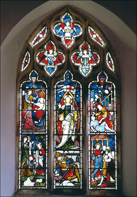 The window show Christ risen from the dead, and some of his miracles. Above, St Peter holds the keys to Heaven and St Paul holds his sword. The inscription at the bottom translates as " I am the Resurrection and the Life".