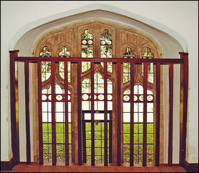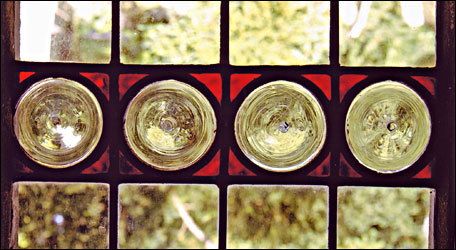 Wineglass stems have been used in this window to give an interesting effect of faux bulls' eye glass