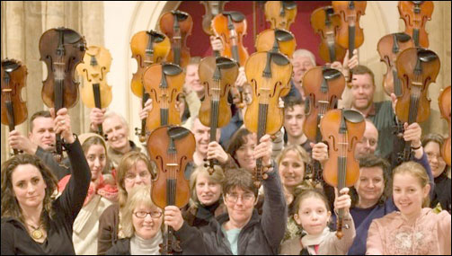 When the Upper Room was completed in Cosgrove Church in 2001, Jenny moved Cosgrove Fiddles there and in 2014 they still meet there on Tuesday evenings. Their performing group “The Big Fiddle Band” rehearse in the Church itself, and make concert and busking appearances for churches, including Cosgrove, charities and street events such as Stony Stratford’s Folk on the Green, Northamptonshire’s “Music in Strange Places” and Great Linford Waterside Festival. They make an annual appearance at the Fiddle Festival of Great Britain.
