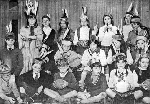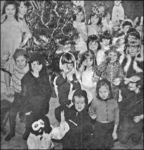 During the interval refreshments were served by the Playgroup mothers and a basket of fruit was raffled. The winner was Mrs. Hillyer. The audience then settled down to watch "The Star Dusters", a comedy about six cleaning ladies, played by Clive Lambert, Elsie Chown, Rose Ridge, Molly Kightley, Pat Shervington and Phyllis Holman. Susan Richards, Kath Gordon, Gloria Alderman and Molly Kightley then appeared in costume and sang a trio of Elizabethan songs. They were disappointed that Mrs. Dora Clarke, who normally accompanies them on the spinet was prevented by family illness from appearing. After a song by "Hairy Mopkins" (Phyllis Holman), the audience was invited to join the whole cast in singing old and new favourites. Mr. Jim Barnes was the pianist.