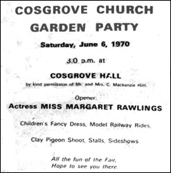 When Canon S. C. Woodward. Rector of Cosgrove, was a child and living in Japan one of his friends was a girl named Margaret Rawlings. Both his father and her father were missionaries serving in that country. On Saturday, childhood memories were revived when Miss Rawlings, the actress of stage and television fame, was at Cosgrove to open the annual garden party held in aid of the village church. The garden party was held in the grounds of Cosgrove Hall by kind permission of Mr. and Mrs. C. Mackenzie Hill and was visited by many people on a beautiful summer day. It was an occasion when the long-established residents and the newcomers to the village, busy serving, were able to co-operate. After declaring the event open Miss Rawlings was presented by Rebecca Runacres with a hand-made lace handkerchief that was made by an elderly local woman. The model railway and the pony rides were a great attraction for the children. There were also stalls and sideshows, children's sports, and fancy dress, judged by Miss Rawlings and Mrs. Mackenzie Hill and a clay pigeon shoot. A tug o' war was won by the local team from the Barley Mow, Cosgrove. A band from Stowe School provided music and the lady helpers were kept extremely busy serving teas and ice cream. Gross takings were in the region of £200 and the church repair fund should benefit by about £150.