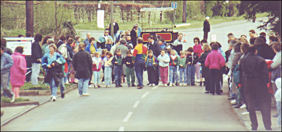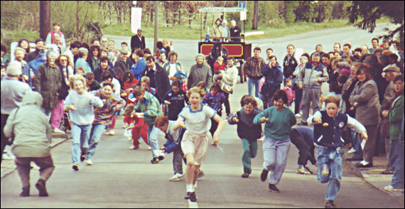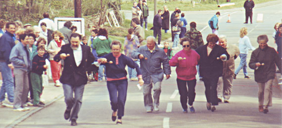The 1992 race saw the start of the post race party moving to the New Village Hall. During the race itself Arthur Noble and Tony “Lofty” Bracey stopped the traffic and Louie Castle emerged as an Egg Race veteran heroine she was followed down the road by a large yellow chick!
