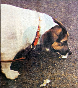 This dog seizes the chance to gobble up one of the dropped eggs.