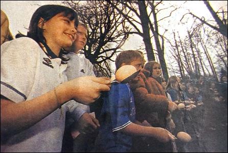 By 2002 the Egg Race was in the capable hands of Tony and Jan Bracey and it was a lot of fun! The day was still raising a good deal of money each year for repairs to the Church, but sadly it seems that this was its final year. |
