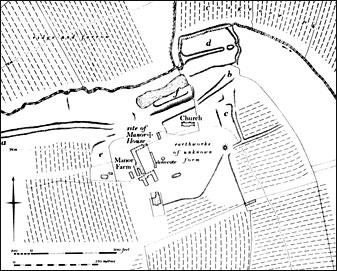 Apart from one of the medieval fishponds, now dry, and part of the post-medieval garden, no earthworks have survived the extensive modern agricultural improvements. However, from air photographs taken before destruction (RAF VAP CPE/UK/1926, 2245-6; CUAP, XT35), more recent air photographs (in NMR) and the modern OS 1:2500 plan (SP 7743) it is possible to reconstruct a plan of the earthworks as they existed in 1947 (Fig. 96). The main feature ol the site was a broad hollow-way ('a'-'b' on plan), presumably the main through road, which ran approximately E.-W. parallel with the stream. At its W. end its line is continued by a broad curving headland which once joined Furtho Lane in Potterspury village but the E. extension of the road cannot be traced. The part of this hollow-way immediately N.E. of the church was between 9 m. and 18 m. wide. Immediately to the S. of this, E. of the church ('c' on plan), there was a series of rectangular paddocks bounded by banks and ditches with, to the S. again, a large circular mound 20 m. in diam. and 1 m. high which still partly survives. To the N. of the hollow-way ('d' on plan) were two long rectangular fishponds separated by a low bank and bounded on the E. by a broad dam. Only the northern pond now survives with the dam up to 2 m. high. Along the valley side to the W. of the church and N.W. of Manor Farm there were other more indeterminate earthworks ('c').