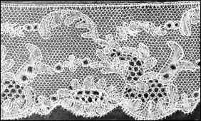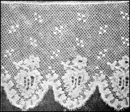A perfect example of Buckinghamshire lace with the Mechlin type of design on the Lille net. Mad by Mrs. Onions a native of Dean, Beds, who lived all her married life in Northants. She made lace for Queen Mary when the Princess of Wales told that some of it was for the robes of our present Prince of Wales when an infant. She made the pattern here shown in a London shop window for a fortnight but was unable to tell the writer the name or the locally locality though it was one of her most treasured recollections.