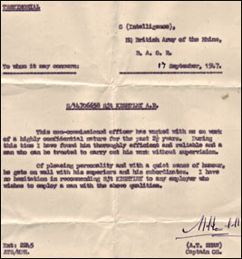 Of pleasing personality and with a quiet sense of humour, he gets on well with his superiors and his subordinates. I have no hesitation in recomending Sjt KIGHTLEY to any employer who wishes to employ a man with the above qualities.