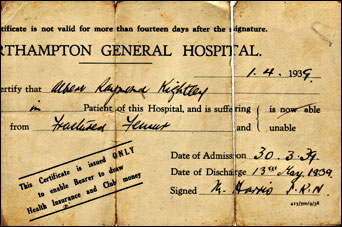 | When he was 13 years old just before the start of the war, Albert broke his left thigh bone something he again had the misfortune to do 69 years later. According to his dairy he was playing football in the recreation ground at Yardley Gobion, and when he was taking a free kick using his right foot, when his left leg twisted underneath him. He fell to the ground and could not get up. He was carried home on a stretcher. The doctor was called for and sent him straight to Northampton General Hospital. It was confirmed that he had fractured his left thigh. The next day they operated; where his leg was set using a wire through his knee to keep it straight. His timetable of events reads:- |