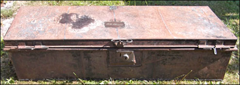 John Marchant, of Knotwood Farm, retrieved from the Priory a campaign trunk containing straps and bags from WW1. The metal plaque on the top declares the trunk as belonging to P Y Atkinson, and the stencilling on the kitbag shows his unit as 5th Dragoon Guards.