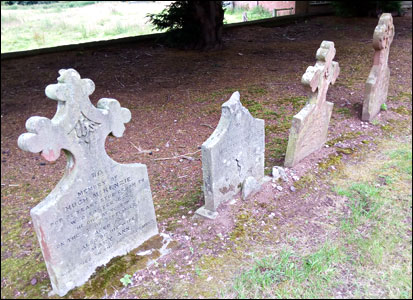| On the south side of Stockton church, just yards away from the master they served, are the graves of some of William Orme Foster's servants. Some are badly worn, but we can identify his butler, who also appears in the 1891 census. Hugh McKenzie, his stud groom, does not appear in the census as, of course, he didn't live in the Foster household. |